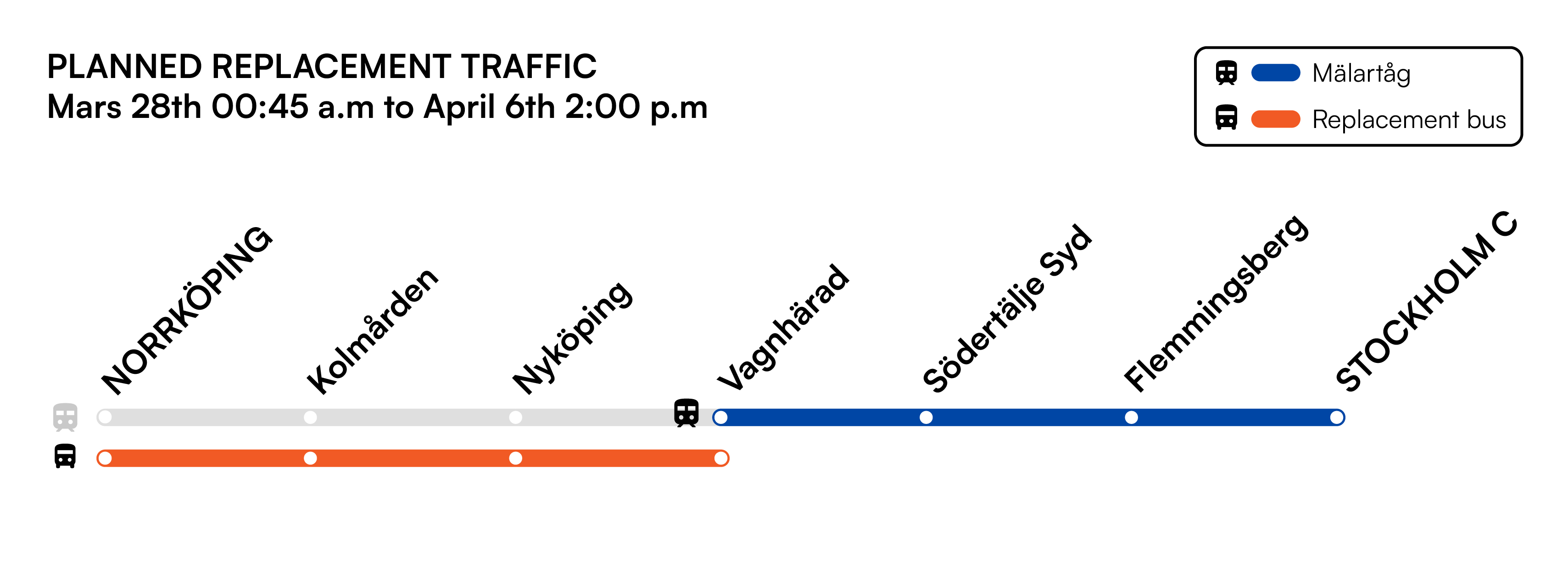 At Nyköping C, a temporary stop will be used for replacement buses 28 March–6 April. Buses will depart from